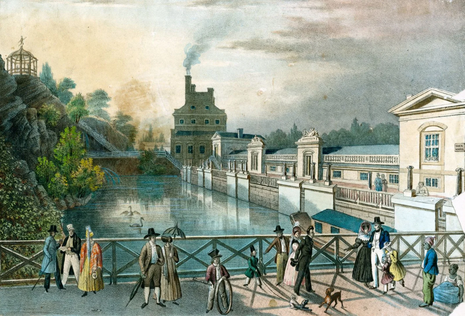 Thanks to Frederick Graff’s ingenuity, his project became not just a crucial piece of infrastructure but also transformed into a popular riverside retreat. He designed two administrative buildings on the mill terrace in the style of classical temples. A pedestrian bridge led to them, offering visitors a chance to stroll and enjoy the roar of the water. An observation pavilion overlooking the Schuylkill River was also built atop the station.